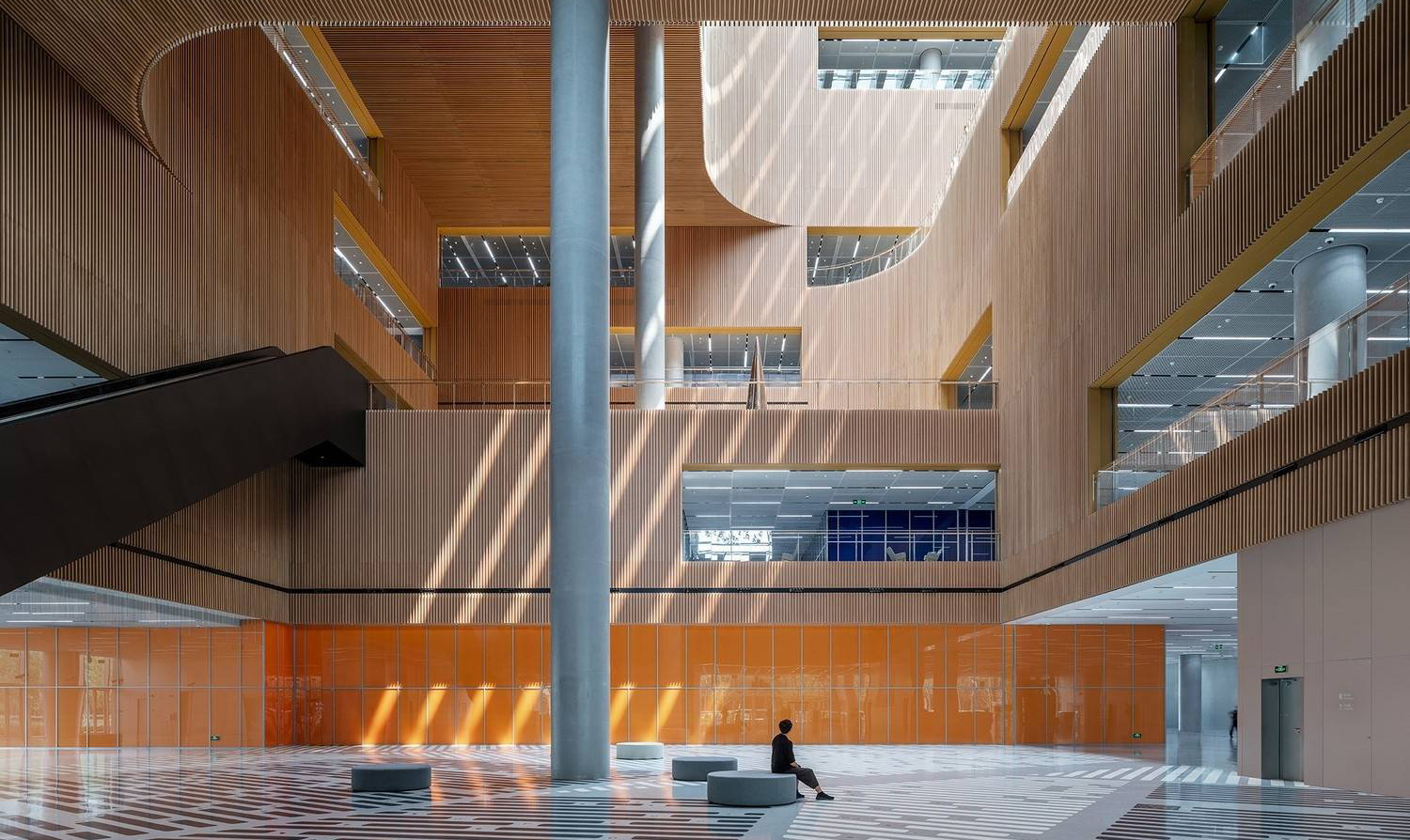 宏偉的中庭空間使用竹子、橡木和水磨石營造出開闊而溫暖的氛圍,熱情地歡迎到訪的讀者。不同樓層不同位置的中庭空間層疊交錯、盤旋而上,七個樓層從視覺上被連接在了一起。