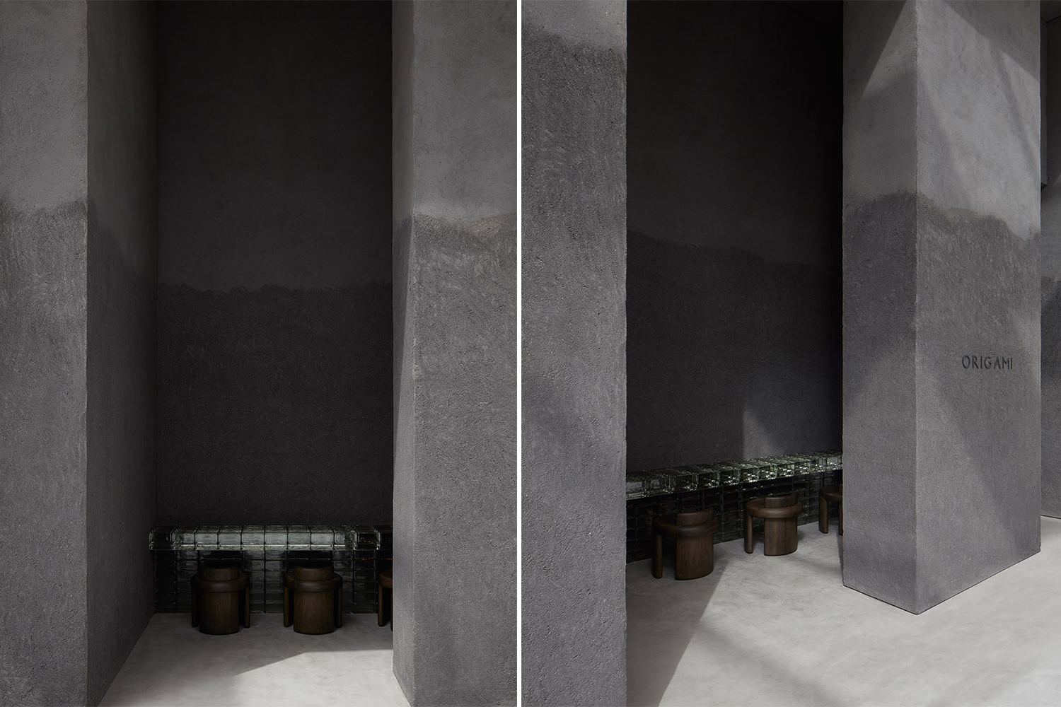 Origami壽司店由迪拜事務所VSHD Design設計,其室內改造以天然材料的簡單形態和有機形狀為特色,反映了日本傳統文化的樸素和極簡主義。它覆蓋著密集的粘土紋理的建筑以寺廟狀的結構呈現,其灰色的色調強調了土質材料的運用。光影的變幻進一步強調了墻壁的紋理,配以昏暗的燈光設計,呼應了傳統日本地下壽司店的氛圍。其他新增元素包括啞光黑瓷磚、折疊座椅和有紋理的玻璃隔板,為餐廳提供了一種真實的全新用餐體驗。該設計激發了人們的好奇心和神秘感,同時使人產生舒適、高貴、和諧和奢華的感覺。這些元素都被包裹在溫和的現代室內設計中,讓人聯想到在簡樸中尋找美的日式哲學。