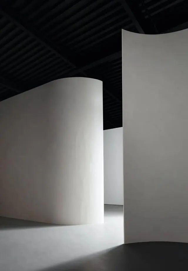 我們運(yùn)用波浪形的墻壁來劃分空間,有利于引領(lǐng)看展人從一個(gè)空間移動(dòng)到另一側(cè)空間。