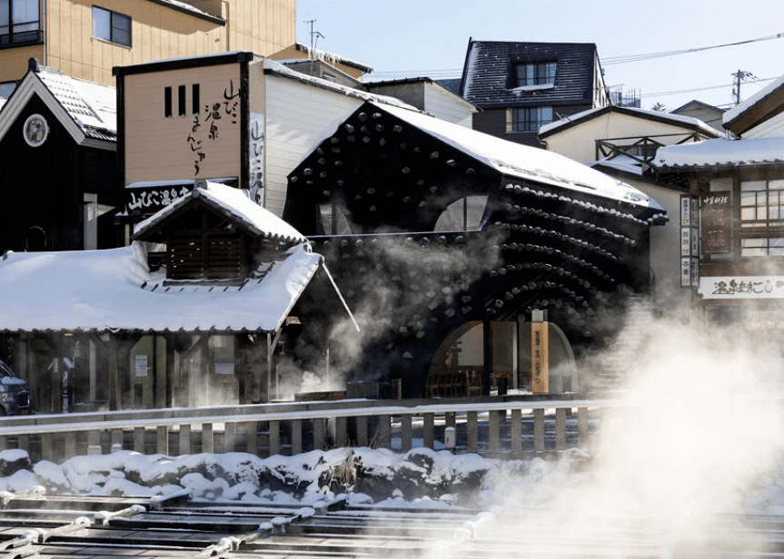 草津溫泉旅館(Kusatsu Kimuraya)是一家只有1間客房的溫泉旅店。草津小鎮(zhèn)位于距離東京西北部約200公里處,以天然溫泉聞名。冒著熱氣的溫泉水流,從附近的草津白根山流向鎮(zhèn)中心的 "Yubatake",字面翻譯過來是 "熱水田"。設(shè)計(jì)師從溫泉升騰的蒸汽中汲取靈感,以?幾何形式的建筑外形,呼應(yīng)溫泉蒸汽上升的柔和運(yùn)動(dòng)以及曲線,與之產(chǎn)生共鳴。