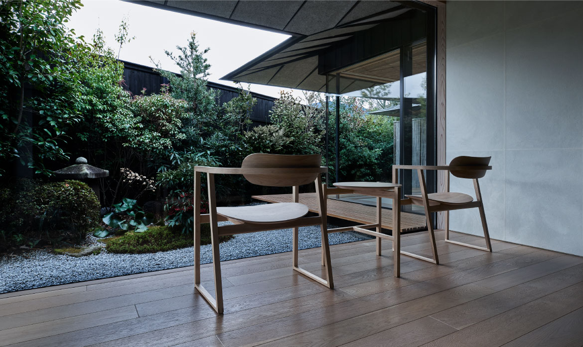 在日本的空間里,為了應對所有的坐姿,也設計了正座椅子。即使是不擅長正座的人和不習慣正座的人,也能悠閑地享受正座。通過絕妙的高度設計,可以自然地融入正座的人們中,多虧了底部適當的曲面,體重移動也很容易。不使用時的樣子也很美,可以像雕刻一樣放置。