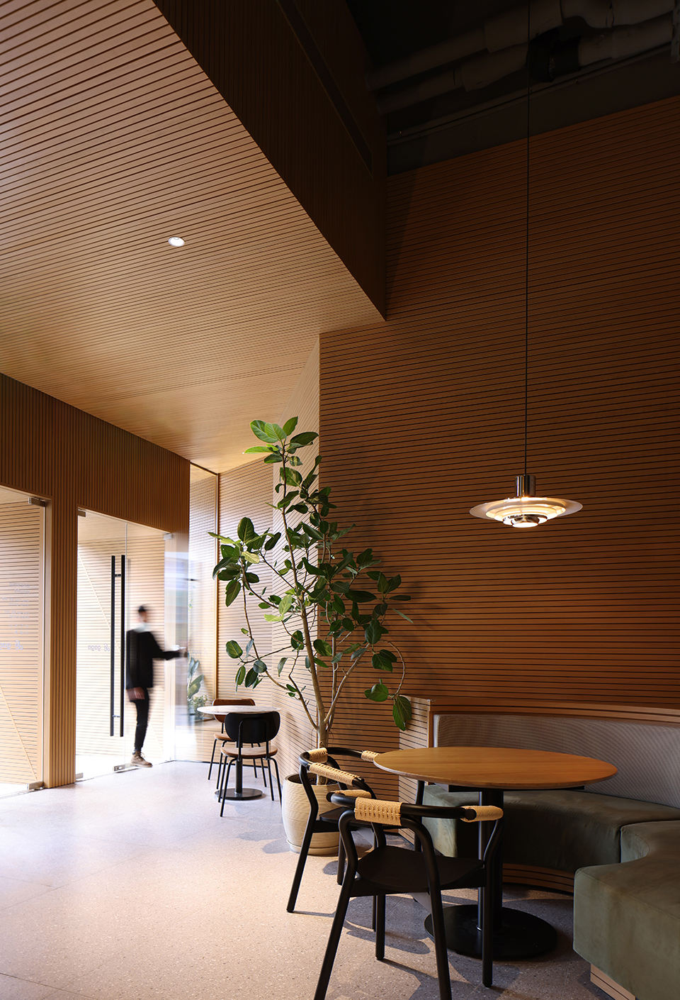 空間材質以溫和的木質搭配綠植為主,讓人與物的關系從城市的工業屬性轉化為自然屬性,為就餐空間創造一個具有場景性的綠洲環境。空間氣質上盡可能避免給人一種“效率化”感受,顏色、材料選擇盡可能地體現“親生物性”,而空間中留有原建筑的跡象,讓二者之間并沒有形成強烈的分隔感,使其相互保持著一種對立與統一。