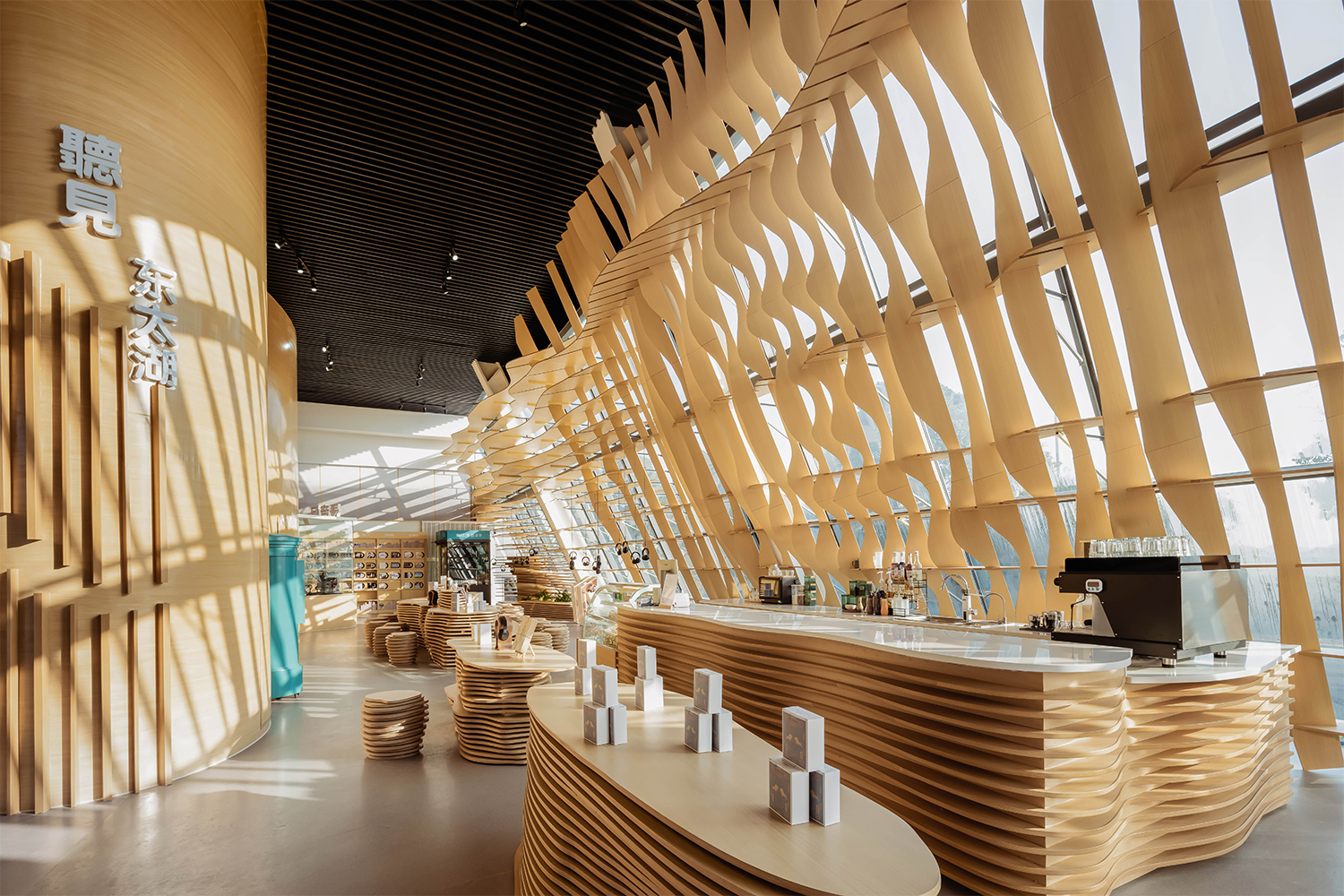 東太湖慧客廳整體風(fēng)格以原木色為主,聲音流淌在木質(zhì)紋路中,給人以溫暖、舒適的感覺。慧客廳的設(shè)計(jì)靈感則來源于太湖景區(qū)的代表元素:太湖水面泛起的漣漪與聲波十分相似,我們從中提取了圓形元素;而湖灣的整體外形又與水流的形態(tài)十分相似,我們從中提取了流動(dòng)的概念,層層圓形與流動(dòng)的線條相結(jié)合生成了整個(gè)展廳的空間。