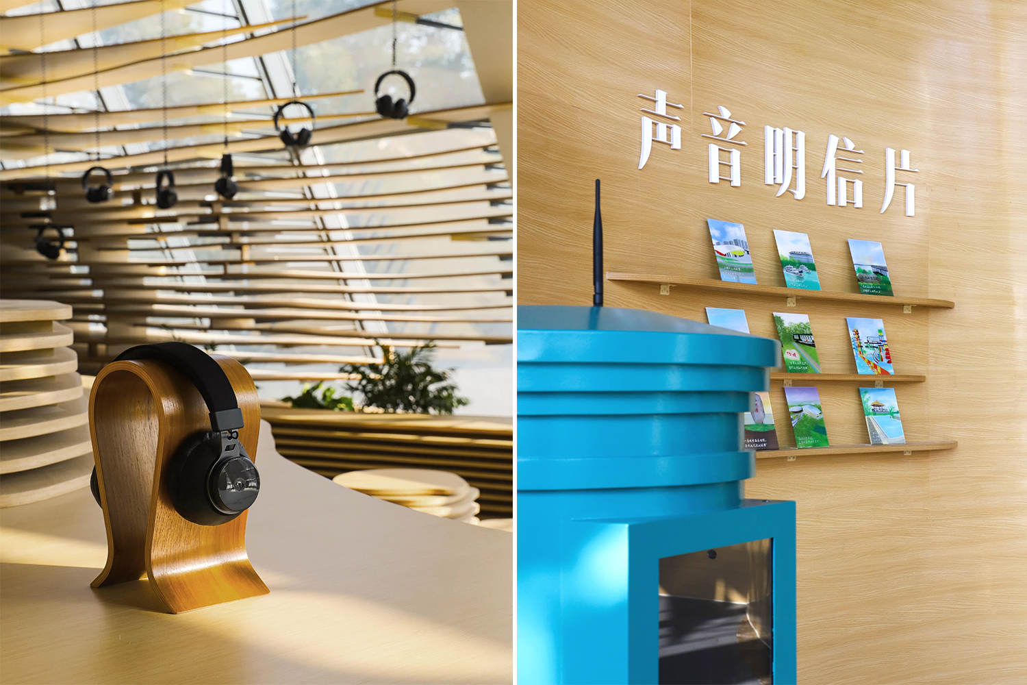 水流的元素貫穿了主廳的整體設(shè)計(jì)。設(shè)計(jì)師采用水流的形態(tài)將整個(gè)空間包覆,所有墻體都由漣漪型的格柵構(gòu)成,在視覺方面讓游客們感受到回蕩在整個(gè)空間內(nèi)的聲音。除此之外,富有流動(dòng)感的墻面容納了“聲音明信片”、“聲音檔案館”、“聲音工作坊”等功能,靠窗一側(cè)的“耳機(jī)森林”、“文創(chuàng)展示”及“休閑座椅”等空間也是依據(jù)相同的理念設(shè)計(jì)而成。展廳內(nèi)的座椅與展臺(tái)也都依托水流形態(tài)延伸而成,與墻面風(fēng)格統(tǒng)一。