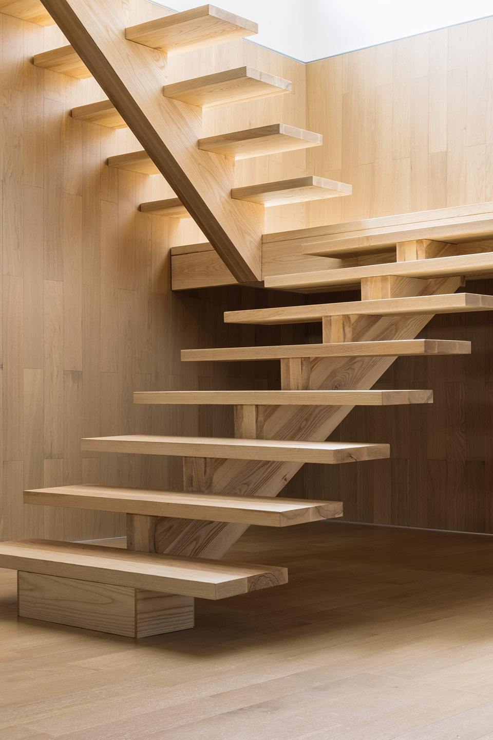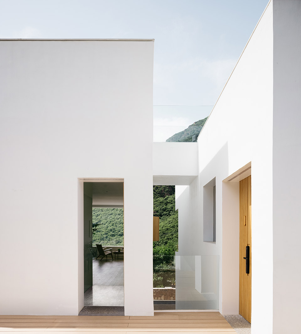 為了處理這兩者之間的關(guān)系,我們結(jié)合功能與場地將建筑主體分為三個白色極簡的體塊,構(gòu)成相對獨立的生活單元,同時為了增加體塊間的趣味性,與場地設(shè)置了三種不同的關(guān)系——嵌入、漂浮與相接。反映到室內(nèi)空間則是地下室、懸挑樓板、下沉休閑區(qū)。建筑體塊之間的甬道,不僅形成可供穿梭的交通空間,使每個房間都可直接抵達(dá)室外,同時體塊與場地的高差關(guān)系,甬道像“橋”一樣把使用者從場地外引入建筑內(nèi)部,縱橫交錯的走廊使身處其中的人迷失在不同的水平與空間。甬道兩側(cè)的墻體框住遠(yuǎn)處的山景以及頭頂?shù)奶炜眨o人一種置身峽谷之間的錯覺。