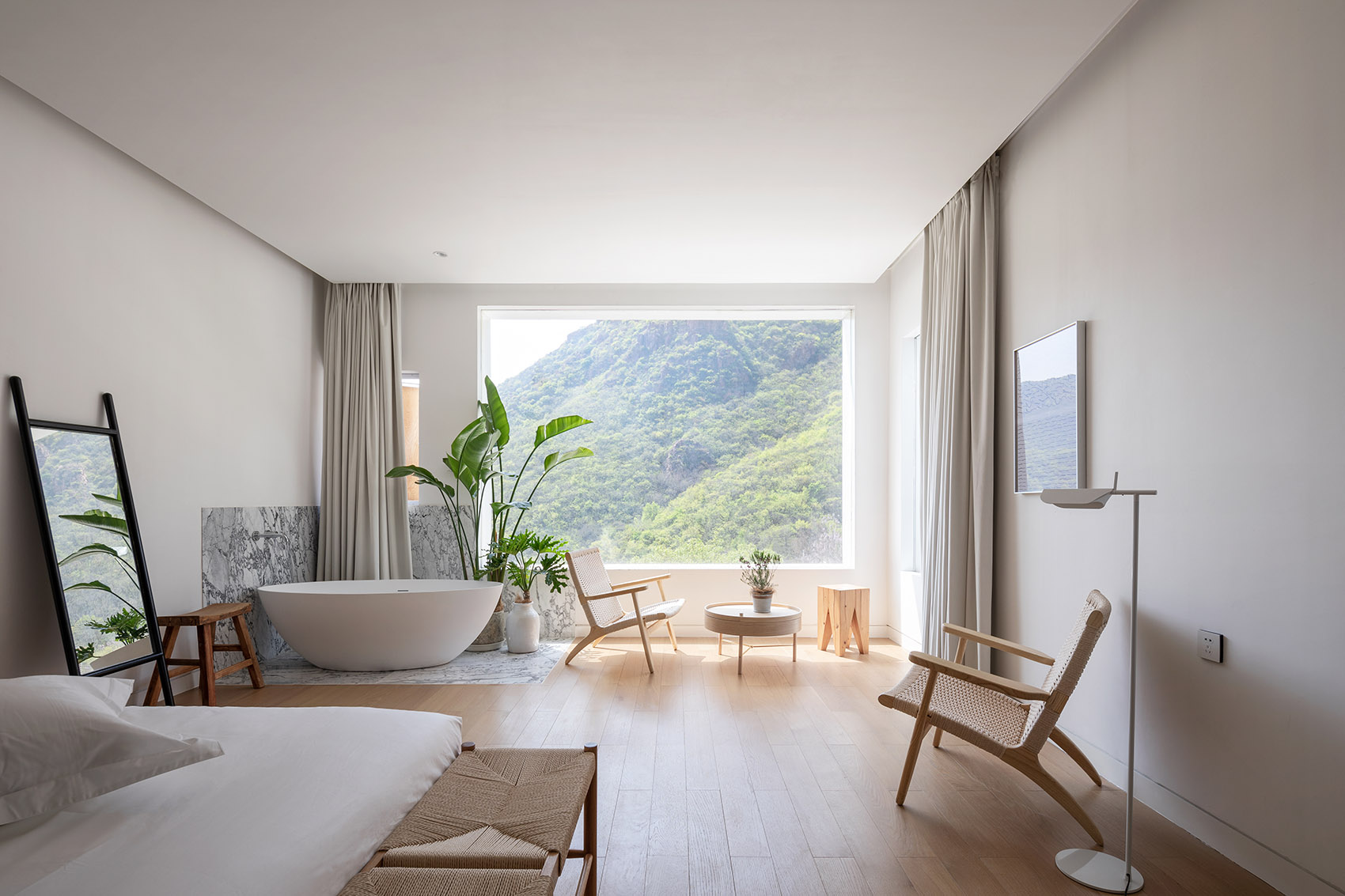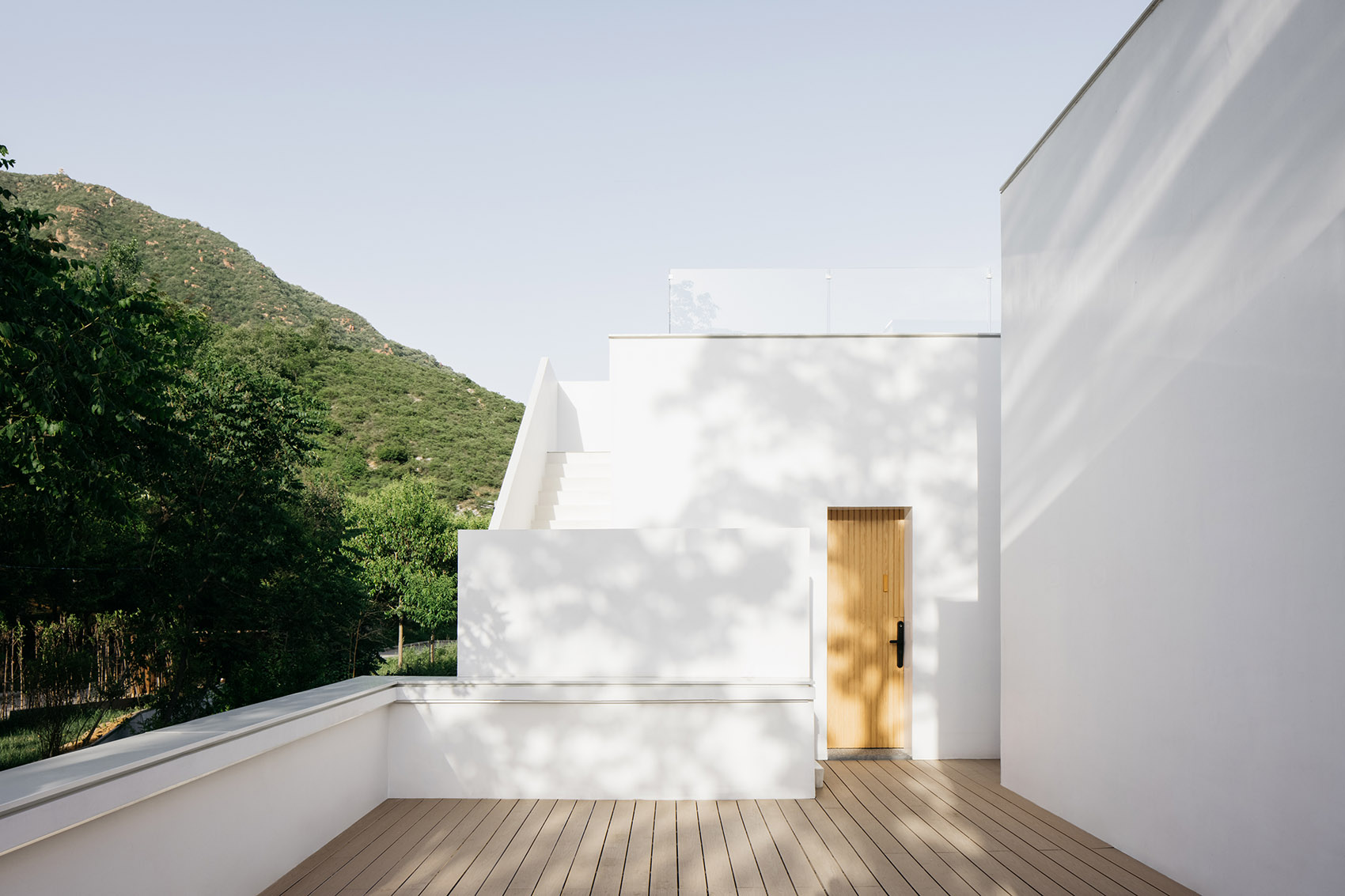體塊之間的進退變化,使室內(nèi)看到不同方向的山景。登上屋頂平臺,不遠(yuǎn)的群山亦像在俯身對望,建筑與自然的對話在山谷間娓娓道來,“我見青山多嫵媚,料青山見我亦如是”。