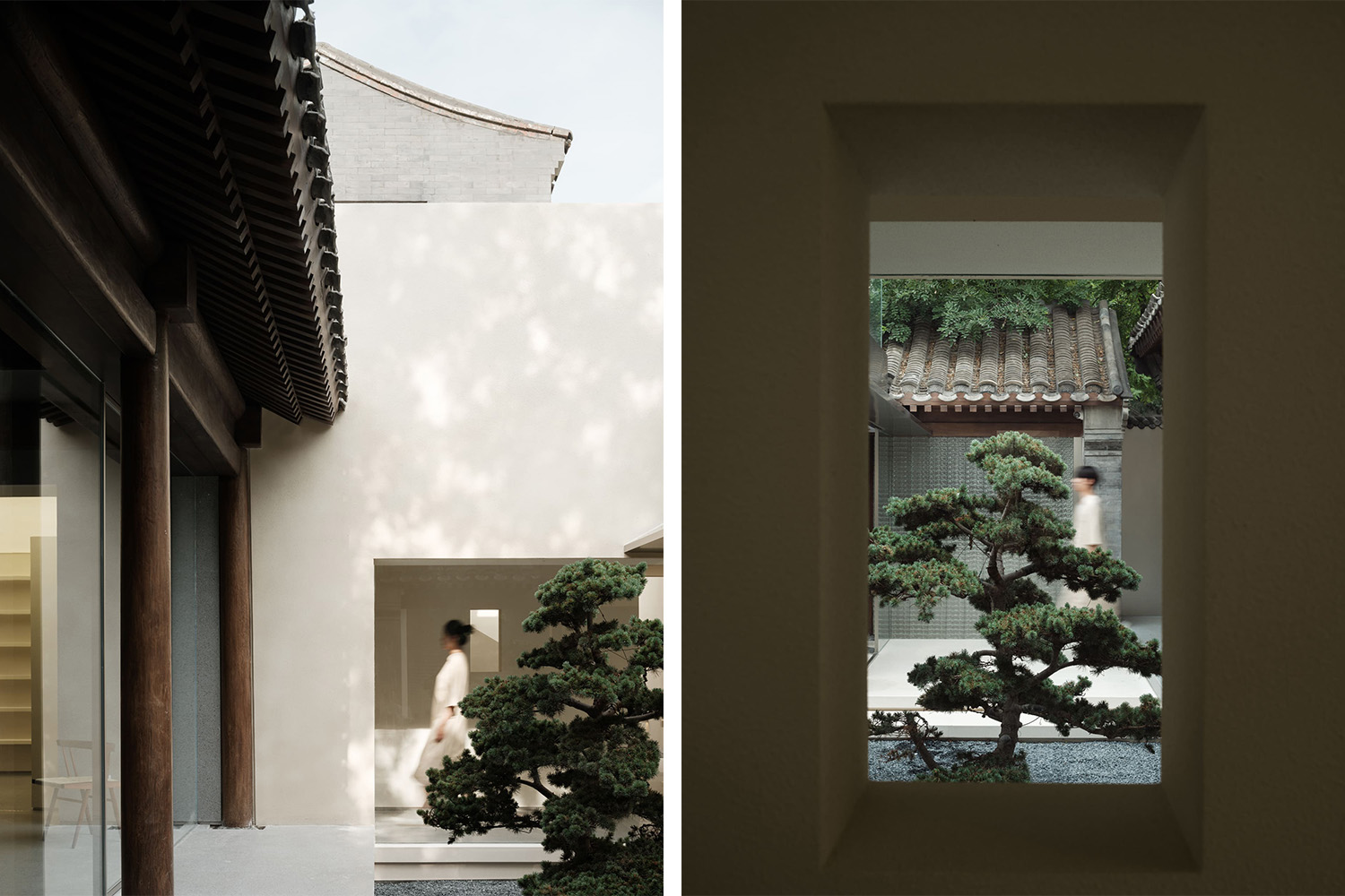 經(jīng)過(guò)篩選的建筑構(gòu)件和空間場(chǎng)景經(jīng)過(guò)“二次曝光”呈現(xiàn)為一系列松散的平行結(jié)構(gòu)。傳統(tǒng)四合院強(qiáng)調(diào)居住空間的私密性和院落之間的遞進(jìn)關(guān)系,從門(mén)屋、廳堂到私室、閨房,布局方正,主次分明。而由民居到公共商業(yè)空間的改造勢(shì)必需要新的設(shè)計(jì)思維——用“反四合院”的方式,弱化了場(chǎng)地整體的封閉性以及院落之間的阻隔,圍合房屋的墻體多數(shù)被玻璃取代,充當(dāng)物理阻隔的同時(shí)讓視線變得通透開(kāi)敞,空間也擺脫了原本局促的尺度和動(dòng)線。