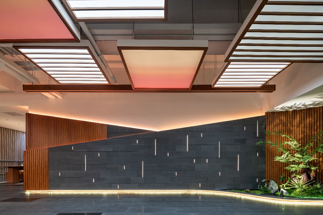 進入大廳映入眼簾的是天花節奏緊密的格柵燈片。燈光分成三組緩緩亮起,溫暖柔和地灑向大廳,令整個展廳成為人們在嘈雜環境中的一處閑暇之地。墻面層疊起伏的造型,宛如大自然的山川,層層疊加,結合柚木色格柵,以及鑲嵌的呼吸燈,遠山的畫面感油然而生。