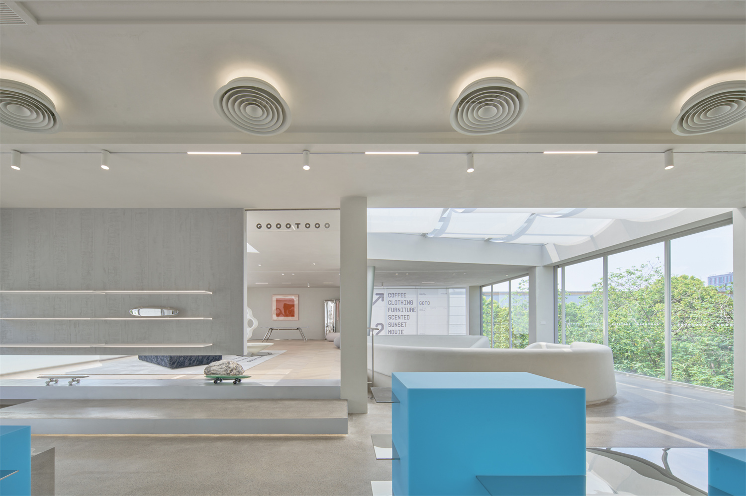 設計師將GOTO文化理解為一種“未被設定”的狀態,懷揣朝著未知目的地出發的向往,回應當代年輕人自由隨性的生活方式。原建筑為機械金屬廠車間,設計師提煉GOTO的品牌調性融于設計語言,用包容而純粹的藝術柔韌度,延續場地的生命力,使原本荒廢落寞的建筑變得親和有趣。