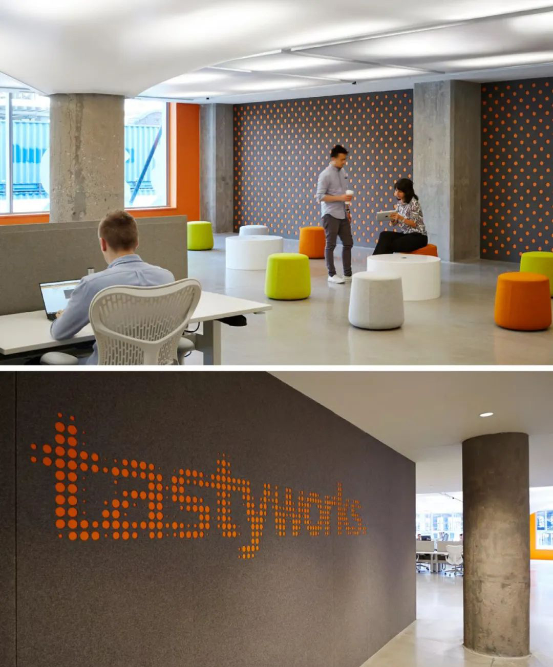 網(wǎng)絡(luò)證券公司Tastyworks的芝加哥辦公室,是一棟冷庫改建的辦公大樓。接待區(qū)的Logo 墻面,設(shè)計選用了Filzfelt棕色的200和橙色的151色號羊毛毛氈,雙層疊加后在表層飾面精確鏤空,將Tasty Works公司的logo通過底層明亮的橙色毛氈透出,克制而不張揚。